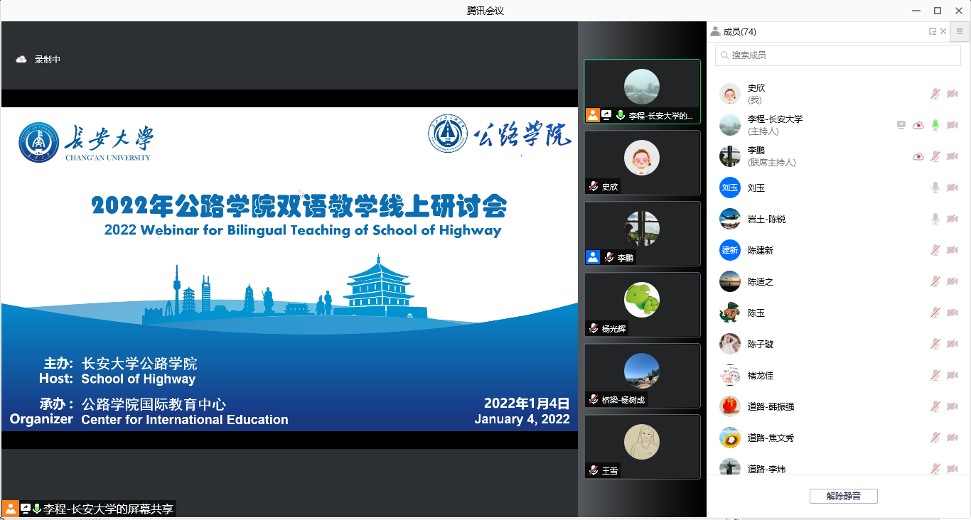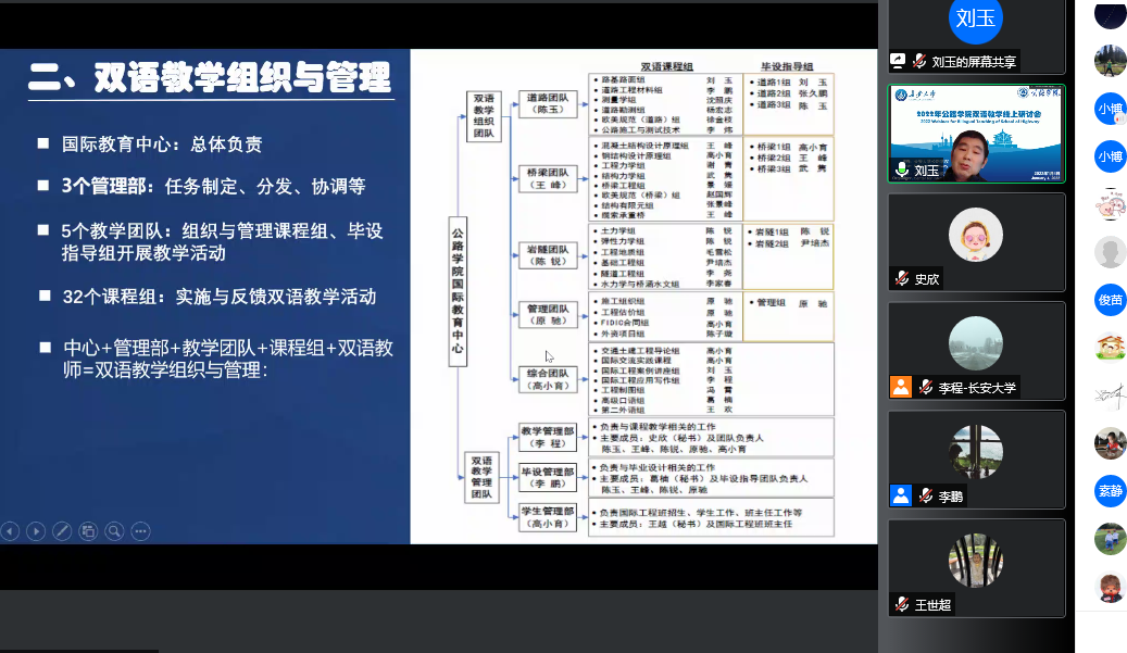 国际教育中心主任刘玉介绍了《bw必威西汉姆联官方网站双语教学管理办法》,重点解读了双语教学组织与管理、双语教学基本要求、全英毕业设计基本要求、双语课程教学工作量考核与分配、全英毕业设计(论文)工作量考核与分配等关键内容。他强调双语教学的核心是专业内容,特色是双语,需要强化“专业能力”和“语言能力”的融合式培养。随后按照道路、桥梁、岩隧、管理与综合四个线上分会场,与会人员对新修订的《bw必威西汉姆联官方网站双语教学管理办法》进行了深入研讨和交流,为进一步完善双语教学管理提出了很多切实可行的建议和举措。
