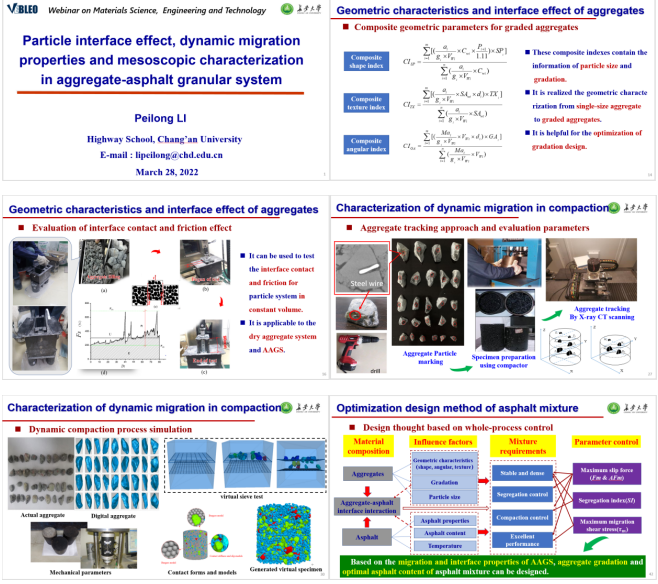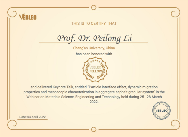 近日,bw必威西汉姆联官网栗培龙教授被授予国际科学组织Vebleo协会会士(Vebleo Fellow),并受邀在Vebleo主办的科学、工程与技术网络研讨会(Webinar onMaterialsScience, Engineering and Technology)中做了主题为“Particle interface effect, dynamic migration properties and mesoscopic characterization in aggregate-asphalt granular system”的主旨报告(Keynote Talk)。栗培龙教授介绍了他和团队在沥青混合料微细观作用行为与机理、表征方法及工程控制方面做出的学术贡献,特别介绍了近年来基于矿料-沥青颗粒体系动态迁移的沥青混合料设计-生产-施工-服役全过程量化表征与控制系列成果。