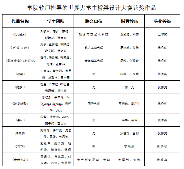 2022年6月26日,“中交公规院杯”2022世界大学生桥梁设计大赛总决赛顺利举行。bw必威西汉姆联官网桥梁工程系赵国辉副教授指导的作品《Light》获得二等奖,赵国辉获“优秀指导教师奖”,桥梁工程系罗晓瑜、陈峰、宋一凡等教师指导的5项作品获优秀奖、3项作品获入围奖。