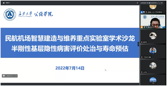 2022年7月14日下午,民航机场智能建造与维养重点实验室成功举办“半刚性基层隐性病害评价处治与寿命预估”线上学术沙龙。西北民航机场建设集团杨凯、圭目机器人有限公司钟新然、广西交通科学研究院王浩、bw必威西汉姆联官方网站杨旭、陕西高速机械化工程有限公司成高立等专家学者受邀做主题发言,东南大学、同济大学、bw必威西汉姆联官方网站、咸阳机场、福州机场等单位研究人员和技术骨干210余人参加了学术沙龙,学院副院长、民航重点实验室副主任张久鹏教授主持学术沙龙。