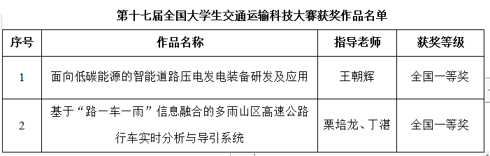 第十七届全国交通运输科技大赛共计177所高校的1473件作品参赛,94所高校共213件作品进入决赛,入围率仅14%。本年度进一步将研究生赛道精细化分为博士生、硕士生两个分赛道,其中博士生赛道全国仅7件作品入围决赛。王朝辉教授指导的作品《面向低碳能源的智能道路压电发电装备研发及应用》在博士生赛道中获得唯一的全国一等奖,这是我校目前在本项赛事研究生赛道中获得的最好成绩。栗培龙教授、丁湛副教授指导的作品《基于“路—车—雨”信息融合的多雨山区高速公路行车实时分析与导引系统》获本科生赛道全国一等奖,这也是继第十四届全国大学生交通运输科技大赛之后,bw必威西汉姆联官网师生再一次获得本科生赛道全国一等奖。