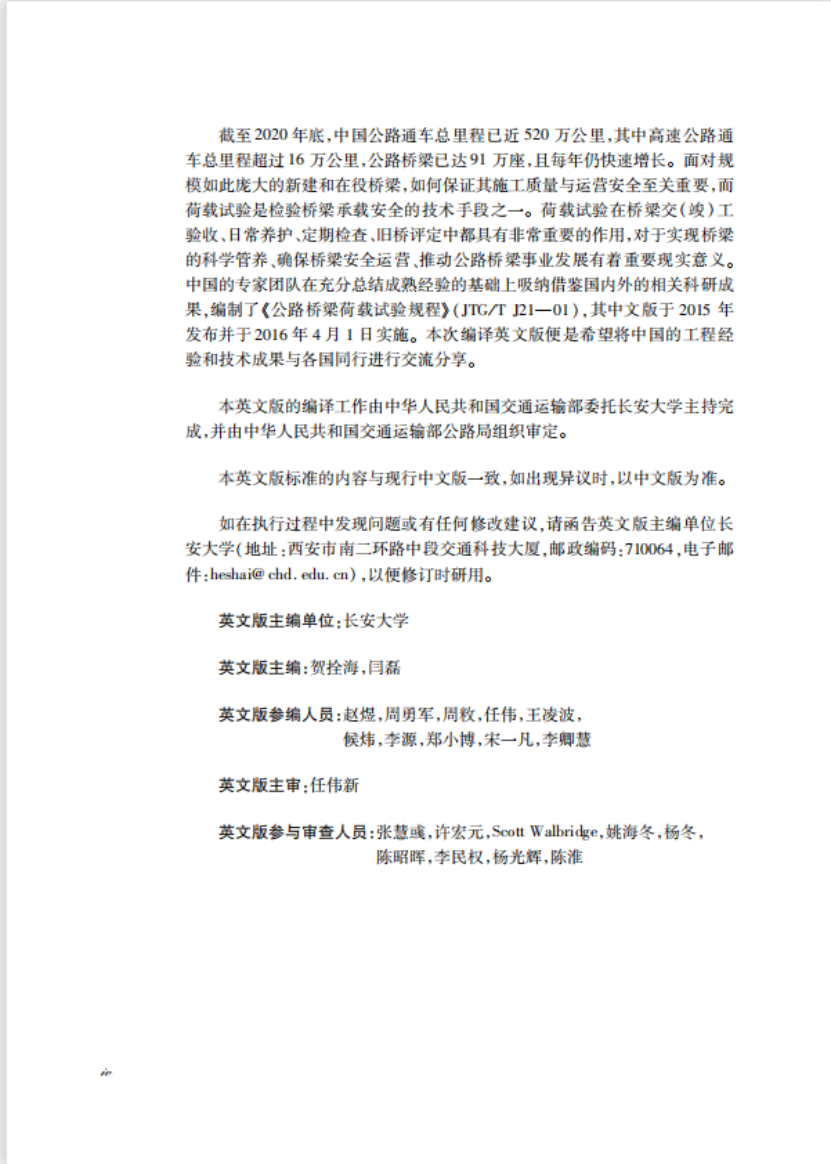 同时由贺拴海教授与闫磊副教授主译的《公路桥梁荷载试验规程》英文版[JTG/T J21-2015(EN)]于2022年1月19日发布。《公路桥梁荷载试验规程》(JTG/T J21-01)中文版由我校主编,于2015年发布并于2016年4月1日实施。本次编译英文版便是希望将中国的工程经验和技术成果与各国同行进行交流分享。本英文版的编译工作由中华人民共和国交通运输部委托bw必威西汉姆联官方网站主持完成,并由中华人民共和国交通运输部公路局组织审定。