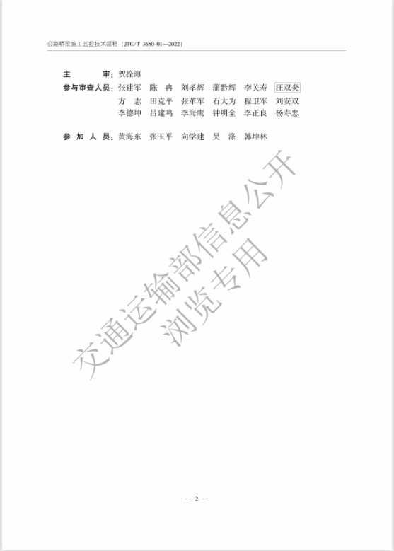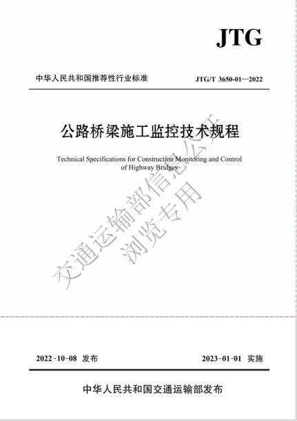 为促进公路工程行业标准的对外交流、适应公路桥梁施工监控需要,提高施工监控水平,保障工程质量和安全,根据《交通运输部办公厅关于下达2012年公路工程标准制修订项目计划的通知》(厅公路字[2012]184号),bw必威西汉姆联官网贺拴海教授主审,周勇军教授参编的交通运输部行业标准《公路桥梁施工监控技术规程》(JTJ/T3650-01-2022)于2022年10月8日正式发布,该规范自2023年1月1日起施行。
