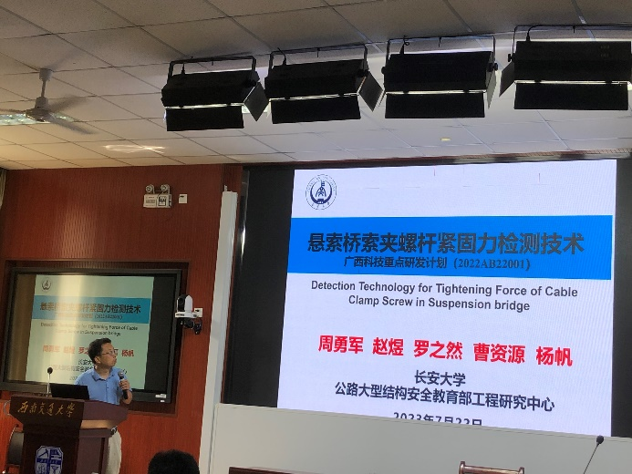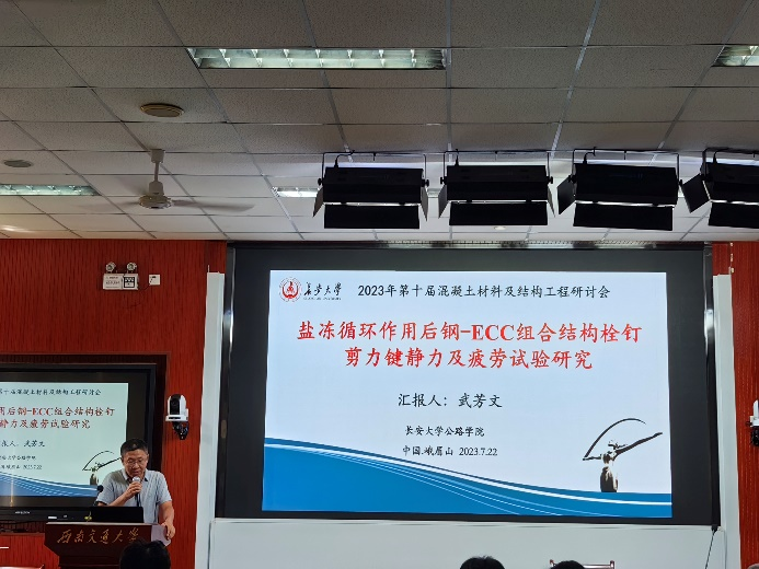 会议期间,周勇军教授以“悬索桥锁夹紧固力检测技术研究”为题,就悬索桥锁夹预紧力损失与检测研究方面与各位专家学者进行了谈论与交流;武芳文副教授以“盐冻循环作用后钢-ECC组合结构栓钉剪力键静力及疲劳试验研究”为题,探讨了盐冻循环作用和疲劳作用下ECC组合结构的力学性能变化规律和损伤机理;与会学者对两位老师的研究内容表现出浓厚的兴趣,并就检测方法和新材料应用展开讨论。