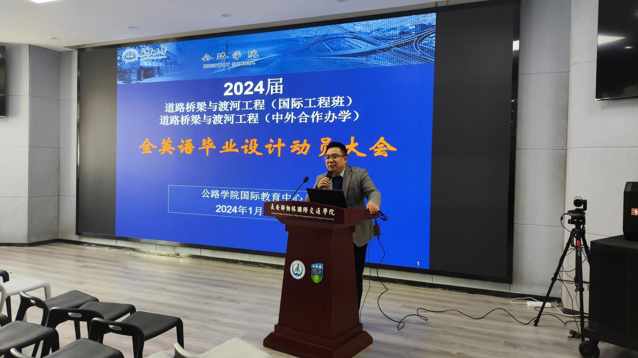 2024年1月11日下午2:00,国际教育中心召开2024届道路桥梁与渡河工程(国际工程班)、道路桥梁与渡河工程(中外合作办学)全英文毕业设计动员会。bw必威西汉姆联官方网站副院长张久鹏教授、长安都柏林国际交通学院教学教务部主任贾婕妤以及250余名师生参加动员会,会议由国际教育中心主任刘玉教授主持。