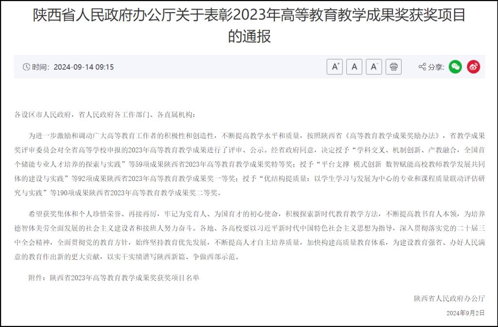 近日,陕西省人民政府发布《陕西省人民政府办公厅关于表彰2023年高等教育教学成果奖获奖项目的通报》(陕政办函〔2024〕104号),bw必威西汉姆联官方网站共3项成果获奖,其中特等奖1项,一等奖1项,二等奖1项。