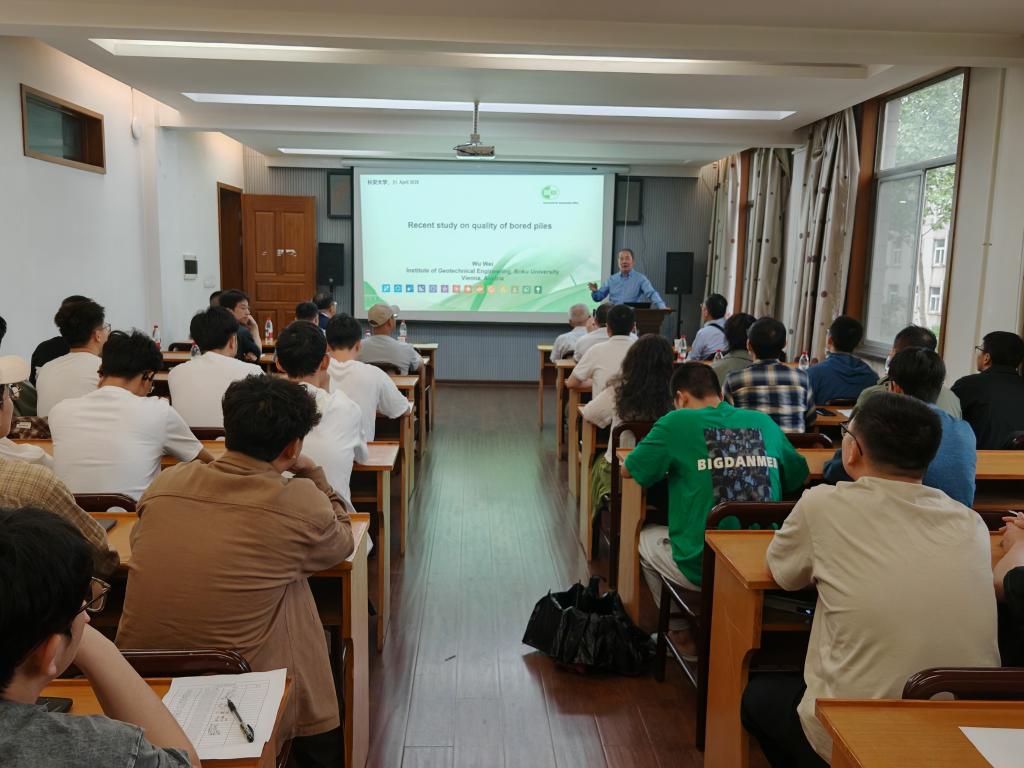 4月21日上午,吴伟教授为师生们带来了题为“Recent study on quality of bored piles”的学术报告。吴教授介绍了团队在过去十年中关于新拌混凝土泌水问题的研究工作,重点分享了灌注桩中混凝土孤立波的试验验证及数学解析的研究成果。报告结束后,师生们与吴教授围绕相关学术问题进行了深入探讨。