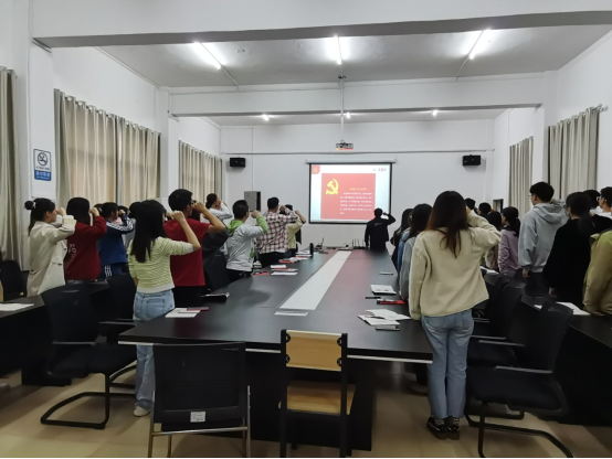 会议第一项由李鼎伟同志带领全体学生党员重温入党誓词,第二项是集体诵读党章-党的基层组织章节,支部书记王海洋带领大家学习学习党的创新理论、学习教育部等七部门印发的《关于加强和改进新时代师德师风建设的意见》(教师〔2019〕10 号)。