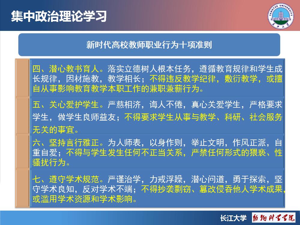 曾庆军说,该《准则》是教育部2018年11月8日印发的,是为深入贯彻习近平新时代中国特色社会主义思想和党的十九大精神,全面贯彻落实全国教育大会精神,扎实推进《中共中央国务院关于全面深化新时代教师队伍建设改革的意见》,进一步加强师德师风建设而制定印发的。《准则》中十个“不得”对教师的职业行为底线界定清晰具体。作为高校教师,承担着“立德树人”,培养社会主义合格建设者和接班人的神圣使命,要坚定政治方向,宣传社会主义核心价值观;要加强自身修养,既要教书,还要育人,学高才能为师,身正才能为范;要知底线,在教学、科研、管理各方面都要严格对照《准则》,自觉守住“教师”的尊严和职业荣誉。