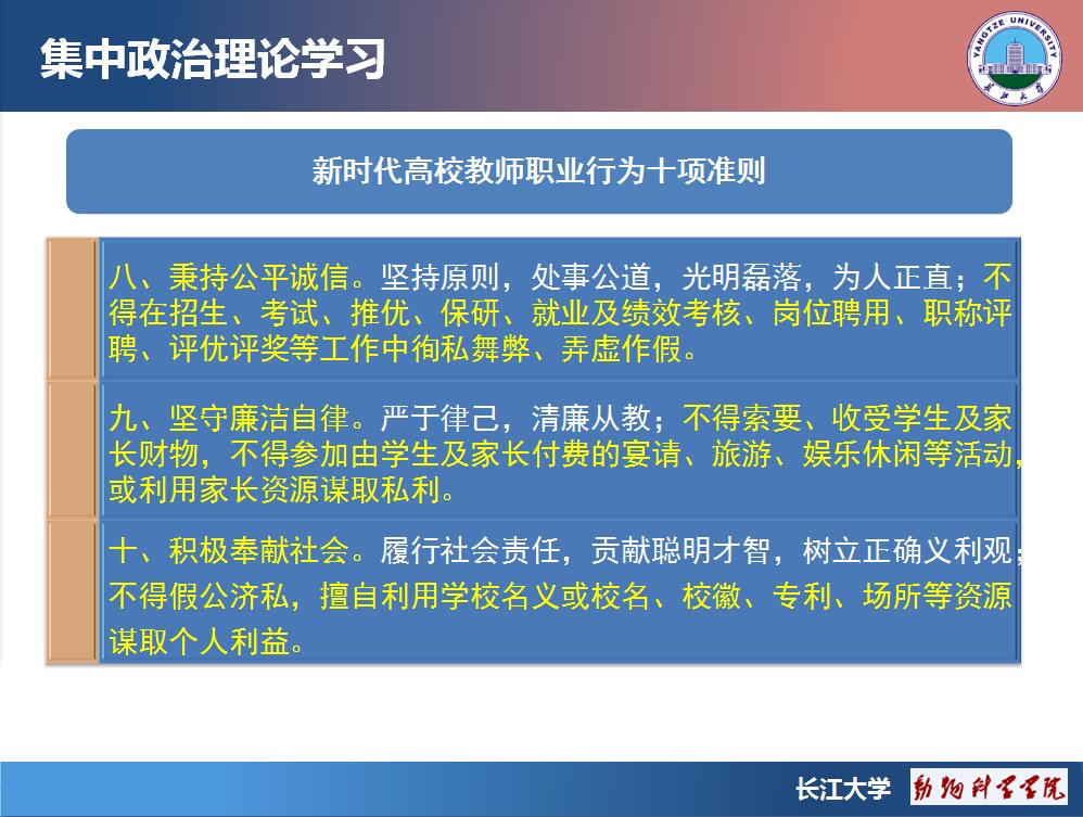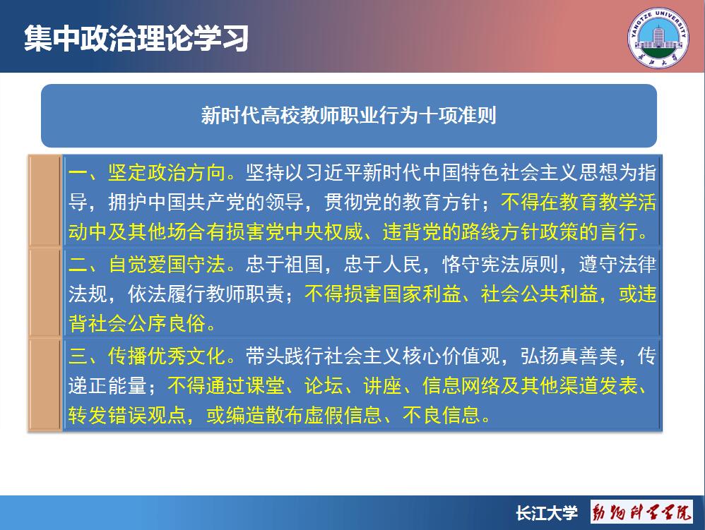 曾庆军利用制作的PPT幻灯片带领全体教职工对《准则》中坚定政治方向、自觉爱国守法、传播优秀文化、潜心教书育人、关心爱护学生、坚持言行雅正、遵守学术规范、秉持公平诚信、坚守廉洁自律、积极奉献社会等十个方面进行逐条学习并进行解读。