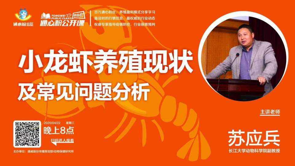 2020年4月22日应通威股份有限公司邀请万象城官网苏应兵副教授针对通威业务员及养殖户进行了一次“小龙虾养殖现状及常见问题解答”专题培训讲座。近年来,小龙虾行情持续火爆,养殖效益明显,小龙虾养殖户积极性高涨。为了提高小龙虾养殖技术水平,切实推进小龙虾产业发展,通威股份有限公司举办了本次技术讲座。苏应兵副教授应邀授课,他主要从小龙虾养殖基本情况、病害防治、新型药物使用、小龙虾养殖塘生态系统构建等方面开展了深入地讲解。视频直播1.54万次,在互动交流中,学员积极发言,苏教授还解答小龙虾生产上遇到的各种技术问题。