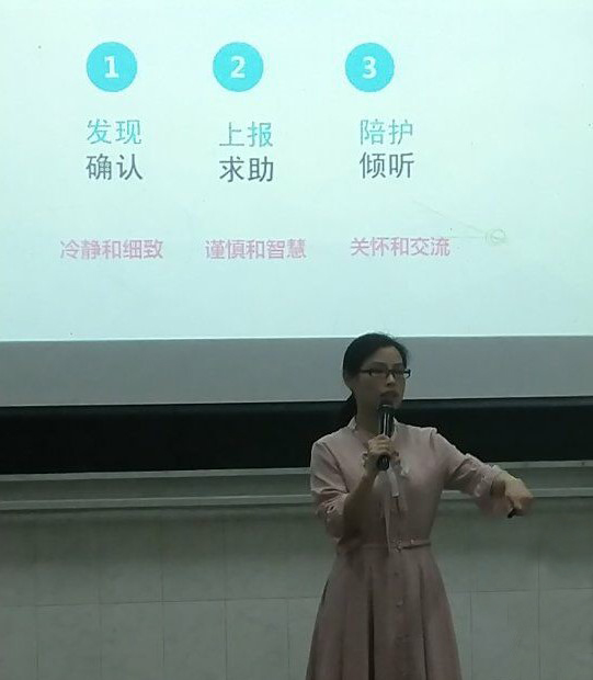 杨湘虹老师从“生命的态度”、“生命之痛”,“守护生命”三个方面向同学们分析了大学生的自杀心理,并着重介绍了抑郁症的相关知识。