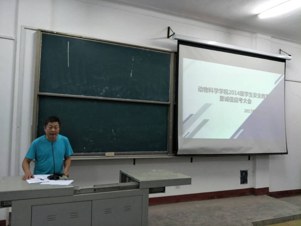 (通讯员蔡懿慧)6月14日晚6时30分许,动物科学学院14级全体学生在文理学院西4-D500开展了安全教育暨诚信教育大会,此次会议旨在为刚刚结束专业生产实习的大三学生传达学校出台的一系列新的政策和规定。出席此次会议的有动物科学学院党委副书记王雨、辅导员段门俊。
