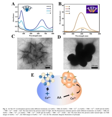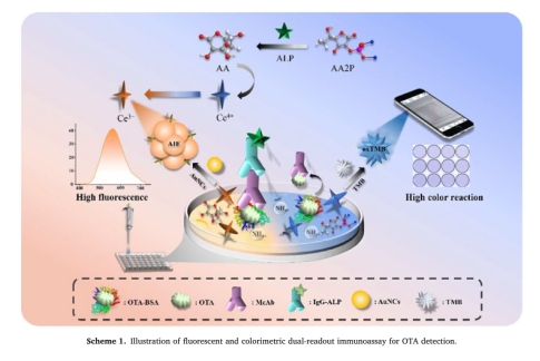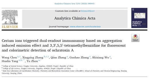 近日,国际学术期刊《Analytica Chimica Acta》(中科院一区,IF:6.911)在线发表了题为《Cerium ions triggered dual-readout immunoassay based on aggregation induced emission effect and 3,3′,5,5′-tetramethylbenzidine for fluorescent and colorimetric detection of ochratoxin A》的研究论文,报告了万象城官网硕士陈旺的荧光和比色双模式纳米生物传感免疫分析研究成果。