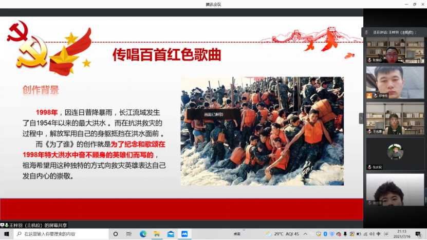 王梓羽同志分享道:从这首红歌中我了解到,在洪水等自然灾害中人民财产的安全离不开解放军的无私奉献,他们用身躯挡在洪水面前,替人民不仅挡住了洪水,还挡住了危险,并且展现出共产党党员为了人民无私奉献的以人民为中心的宗旨,与历史上革命战士们为着革命胜利而无私奉献的精神一样伟大。