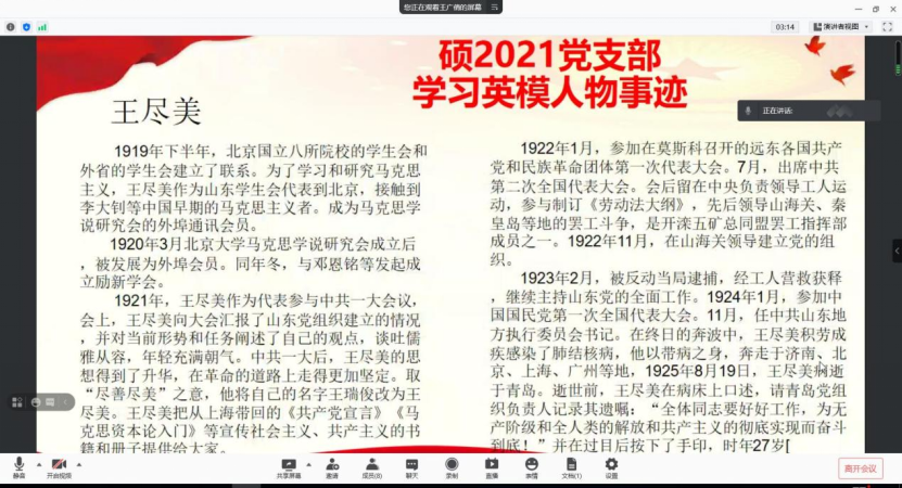 在中国共产党成立100周年之际,为深化党史学习教育,厚植爱国主义情怀,进一步推动红色精神的传承,bw必威西汉姆联官方网站研究生党支部在党委号召下于7月5日以来陆续开展“五个一百”系列学习会议,本次学习教育以学习百名英模人物为主题展开。