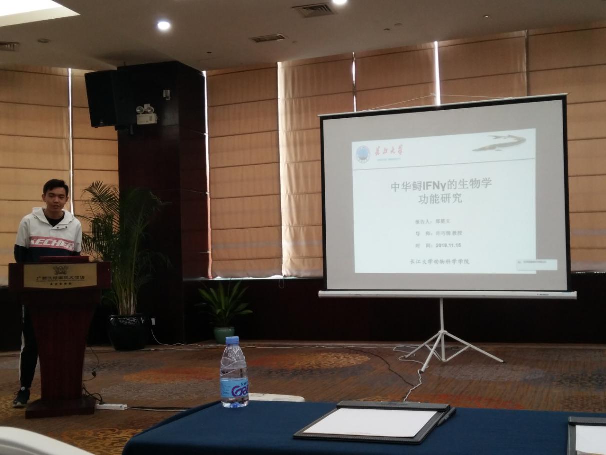 万象城awc官网登录入口动物科学学院水产免疫与营养团队袁汉文副教授、田光明副教授和郑楚文师生三人很荣幸受邀参加此次会议,研究生郑楚文以“中华鲟IFNγ的生物学功能研究”为题做了分会场汇报。