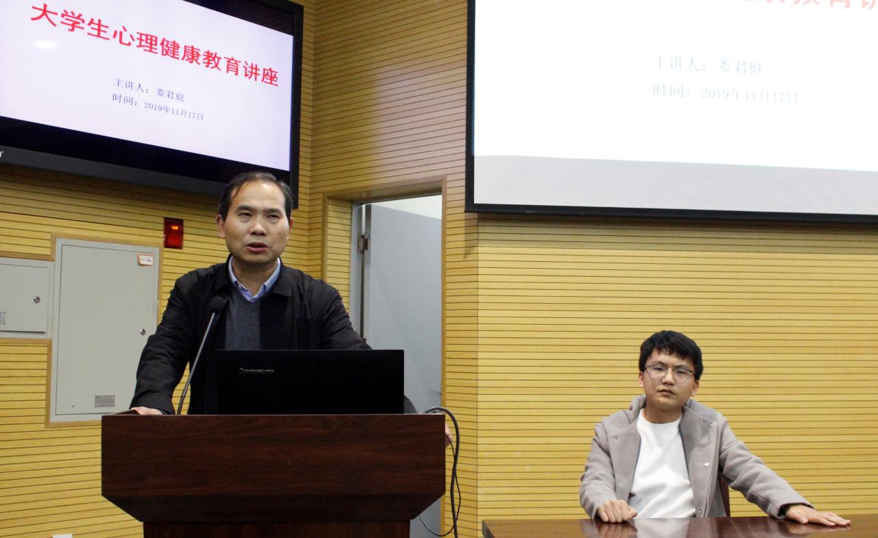 (通讯员:卢倩/摄影:何丽娟)为了普及大学生心理健康教育知识,促进大学生的身心健康发展,动物科学学院于2019年11月17日晚上在西校区农科大楼1056报告厅举办了第二次大学生心理健康教育讲座。此次讲座由辅导员娄君庭老师主持主讲,计算机科学学院辅导员张颖旭老师受邀出席会议并作报告。