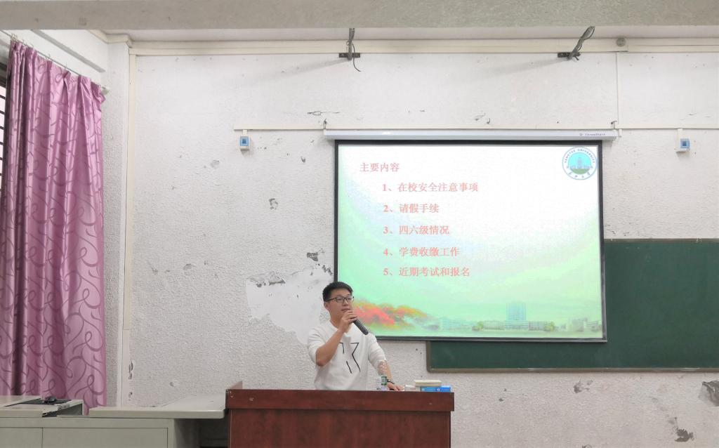 会议伊始,王海洋老师进行讲话,王老师以校园安全和寝室安全为重点提出“生命高于一切,安全永记心中。”并用实例为同学们敲响警钟。同学们也是纷纷点头,表示不会做违纪的事情。其次,王老师借英语四六级情况呼吁同学们,“即使过了四级,也不要放纵自己,要做一个自律的人。”然后,王老师对学费收缴、请假手续以及近期的考试等问题为同学们一一讲解。最后,由苏书记进行讲话,她提出:“大家已经是大二的学生了,要做一名有目标有追求的人,大二不能荒废掉,要有计划有目的的学习,一步一步的实现自己的目标。”除此之外,苏书记强调不要去触碰违纪的事情,“生命只有一次,要格外珍惜。”