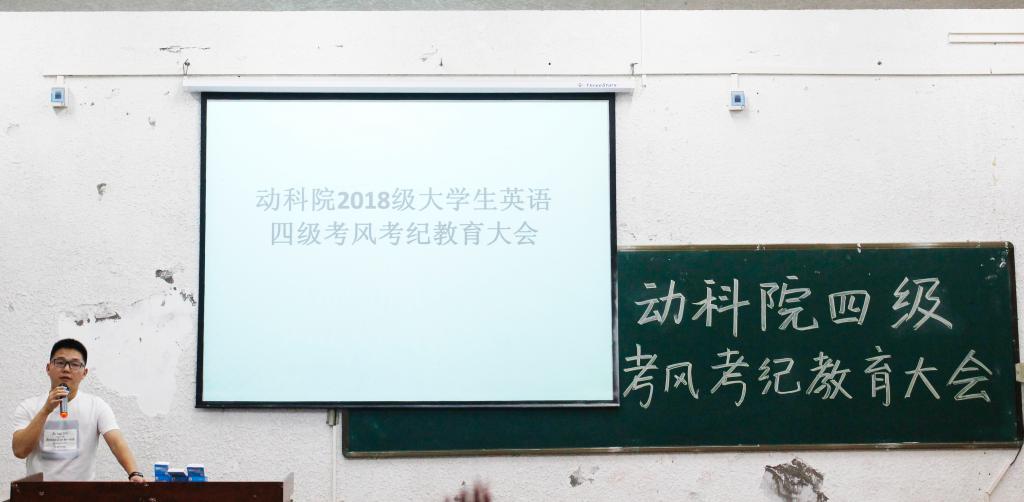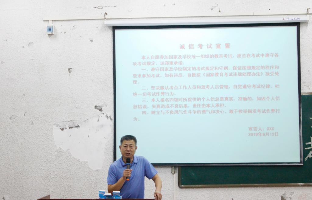 大会伊始,王海洋老师根据同学们的模拟考试成绩作出分析,对同学们的现状作出点评。“同学们还是有着很大的进步空间,积累很重要,但也需要注重各种做题技巧。虽然成绩很重要,但一定不要作弊。”就此,王海洋老师仔细的讲述了英语四级考试前和考试时可能会遇到的一些问题,并且讲解了一些学校对考试作弊行为的认定和处理办法,告诉同学们应该树立诚信意识,认清考试舞弊行为的危害性和不可弥补的严重后果。