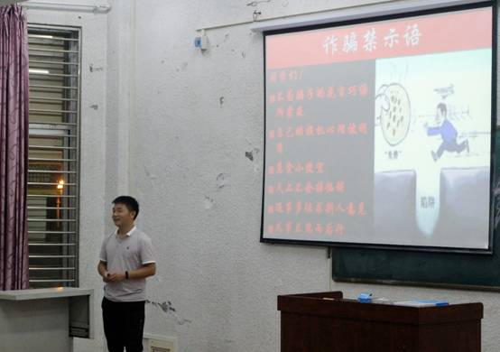 第二部分主要是学生寝室、教室防盗知识,列举出“撬门扭锁”“翻窗入室”等常见盗窃方式和易发生盗窃案件的时间。了解防盗知识,着重强调防盗注意问题以及遇到可疑人员时的措施。期间,王老师以学长学姐被盗经历告诫我们要学会保护自己的财物,然后是如何防诈骗,通过图片与案例了解骗子的诈骗手段,比如假冒身份的短信诈骗,“美好爱情”下的传销组织等。