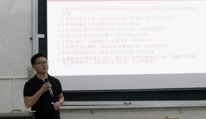 会议围绕考试注意事项、端正考风及加强学生安全意识等方面展开。王海洋老师向同学们介绍了英语四六级及期末考试的注意事项和考试时间、流程,叮嘱同学们保持正常心态,合理安排时间。并着重强调考风问题,要求同学们树立正确的考试观与荣辱观,严格遵守考试制度,杜绝任何违纪作弊行为。针对人身安全问题,王海洋老师将当前大学生所面临的防火、防盗、交通等安全问题进行了详细讲解,并结合多年工作经验提出预防措施和解决办法,用身边案例叮嘱同学们在日常生活要时刻保持警惕。