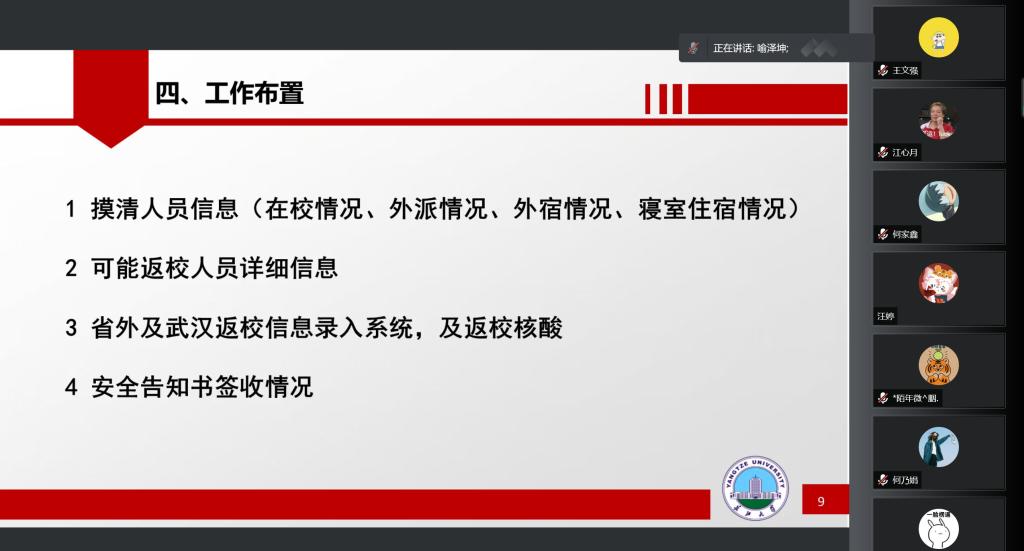 最后,对接下来的防控工作向大家进行说明,各班要摸清在校人员信息,包括:在校情况、外派情况、外宿情况等。返校人员严格按照规定返校,做核酸。落实安全责任书签收情况,对不在校同学要留有记录。