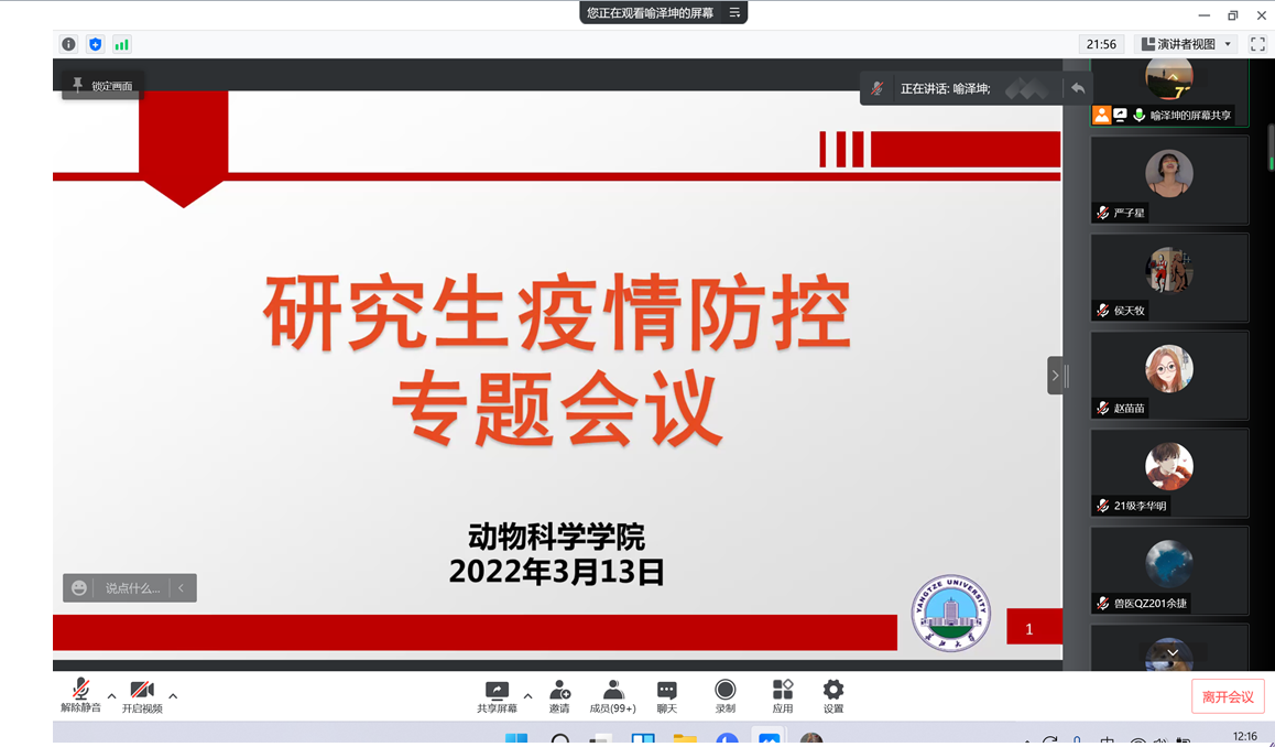 (通讯员:喻泽坤)近日来,国内疫情形势逐渐严峻,根据学校疫情防控相关要求,为落实研究生疫情防控管理,保证在校研究生人身财产安全。2022313日中午1200分,我院通过腾讯会议开展了研究生疫情防控专题会议,本次会议由研究生辅导员喻泽坤主持,党委副书记苏晓云,辅导员杨湘虹参加。