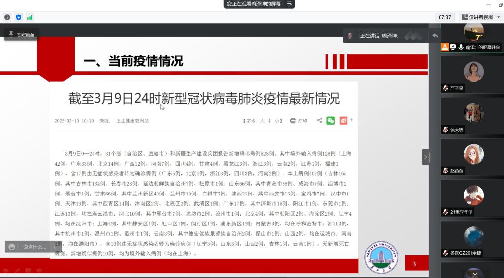 本次会议分为三个部分,首先向同学们说明近期国内各省市的疫情形势以及高校突发事件情况,使大家能够及时了解当前情况,提高警惕性和自我保护意识。