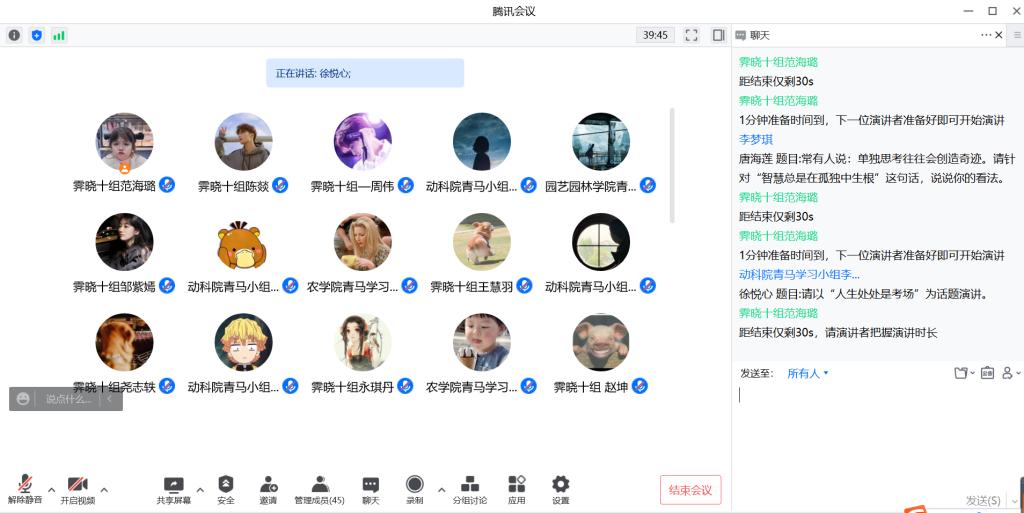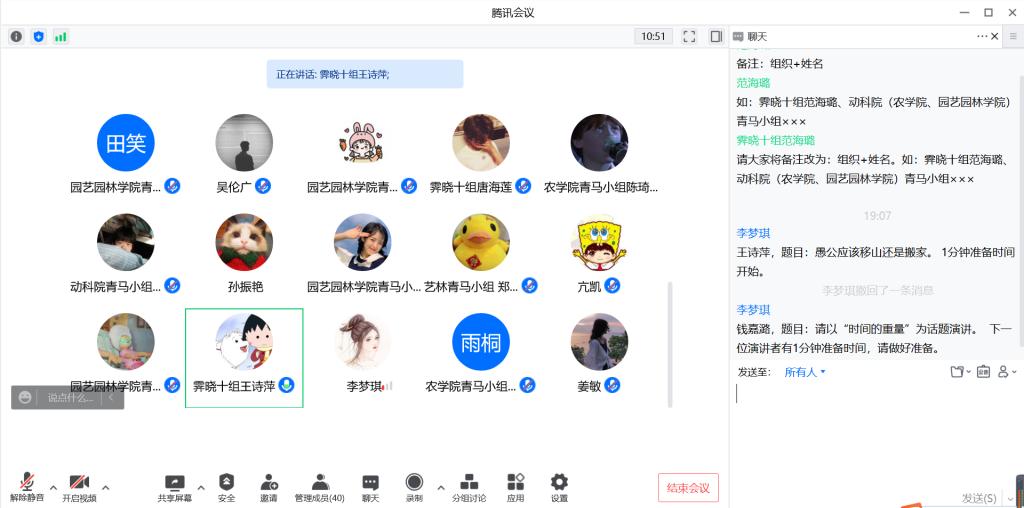 (通讯员:范海璐 刘雨双)为增强个人演讲能力,提高临场发挥水平,4月3日晚7时,万象城awc官网登录入口第二期青马学习小组在线上旁听校青马班霁晓十组的即兴演讲交流会。此次活动邀请到的评委有第十六期校青马班学生辅导员孙振艳、吴伦广以及动物科学学院学生会主席王珏,园艺园林学院和农学院的青马小组一同旁听学习,并由霁晓十组组长范海璐主持。