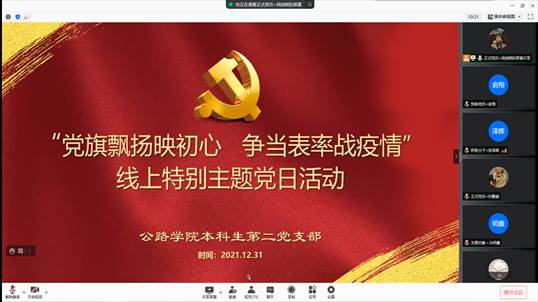 2021年12月31日晚19:00,bw必威西汉姆联官方网站本科生第二党支部全体支部成员、发展对象与入党积极分子开展了“党旗飘扬映初心争当表率战疫情”线上特别主题党日活动,本次活动由支部副书记周迪辉主持。活动过程中,支部副书记周迪辉总结了前一段期支部的抗疫工作,并规划和安排了下一阶段的抗疫志愿工作。同时,在本次抗疫志愿服务中表现突出的学生党员、发展对象与入党积极分子还分享了志愿服务经历。最后由支部书记贺志豪老师进行总结,贺志豪充分肯定了支部全体学生党员在前一段时期为学校抗疫工作所做的贡献,并鼓励大家在今后继续发挥党员先锋模范作用,为战胜疫情贡献力量。